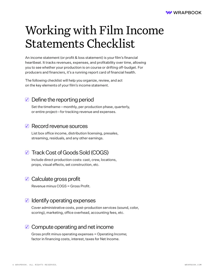 Once your film is streaming and/or playing in theaters, your income statement helps track revenue from box office, licensing, and sales. These numbers are particularly crucial to manage because they affect repayment schedules. Your income statement compares project income versus your total project expenses in order to assess profitability.